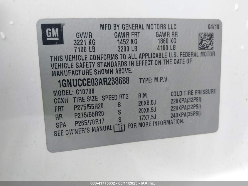 Color WhiteCylinders 8Drive UnknownVIN 1GNUCCE03AR******State Run & Drive VerifiedDamage Left sideAuction date 2025-03-21