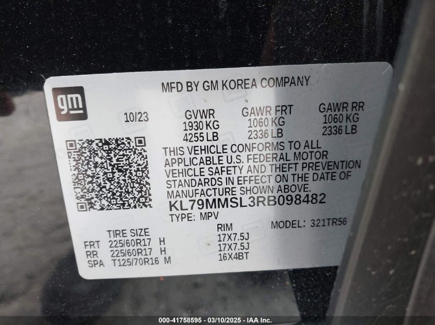 Color BlackCylinders 3Drive Front wheel driveVIN KL79MMSL3RB******State Run & Drive VerifiedDamage Front or back