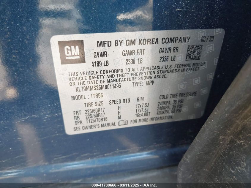 Color BlueCylinders 3Drive Front wheel driveVIN KL79MMS26MB******State Run & Drive VerifiedDamage Front or back AutoRIA