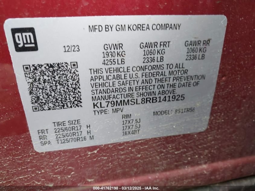 Color RedCylinders 3Drive Front wheel driveVIN KL79MMSL8RB******State Run & Drive VerifiedDamage Left side