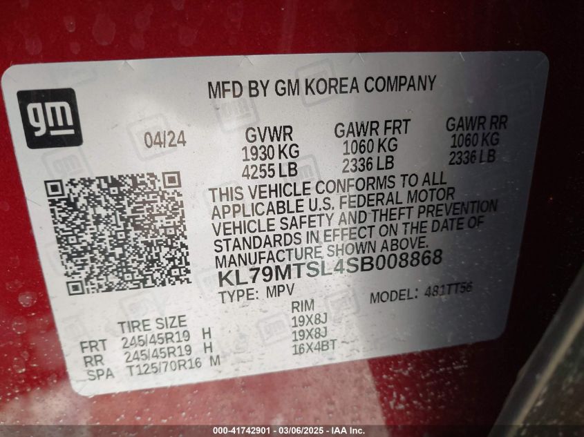 Color RedCylinders 3Drive Front wheel driveVIN KL79MTSL4SB******State Run & Drive VerifiedDamage Bottom