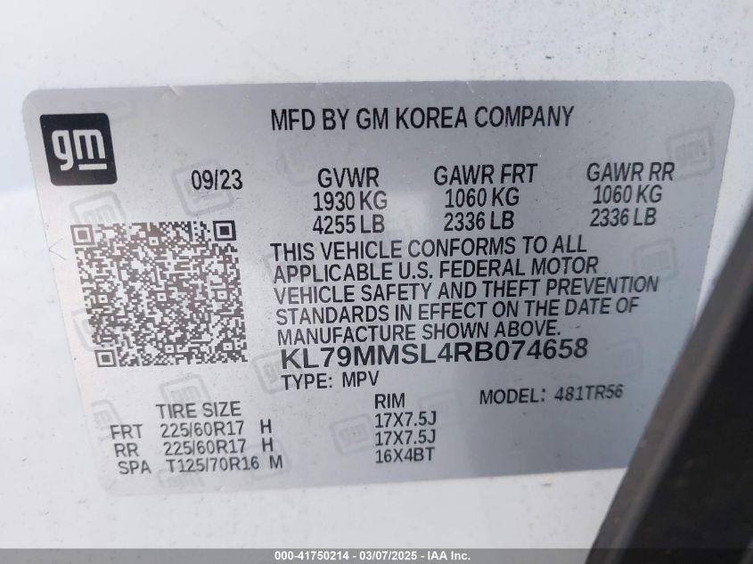 Color WhiteCylinders 3Drive Front wheel driveVIN KL79MMSL4RB******State Run & Drive VerifiedDamage Front or back