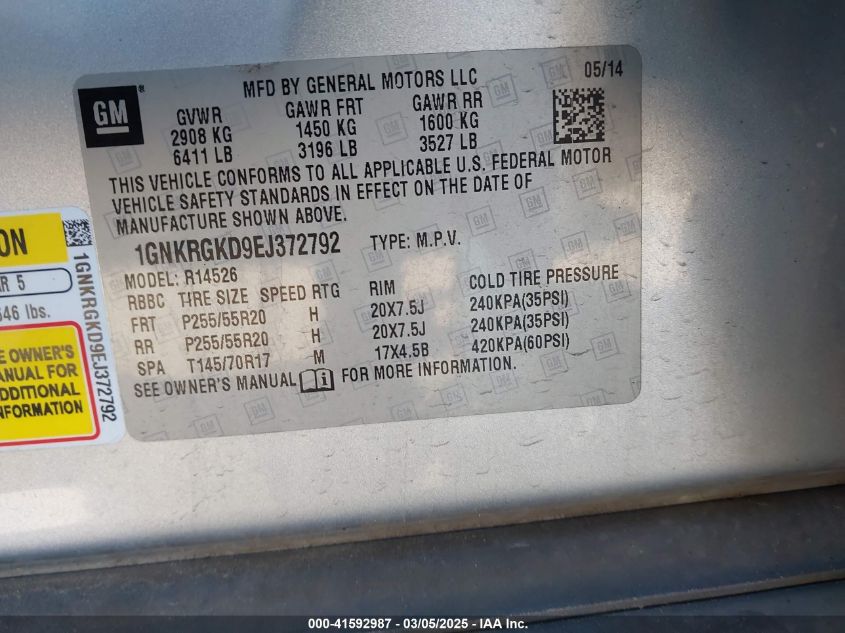 Color SilverCylinders 6Drive Front wheel driveVIN 1GNKRGKD9EJ******State Run & Drive VerifiedDamage Right side AutoRIA
