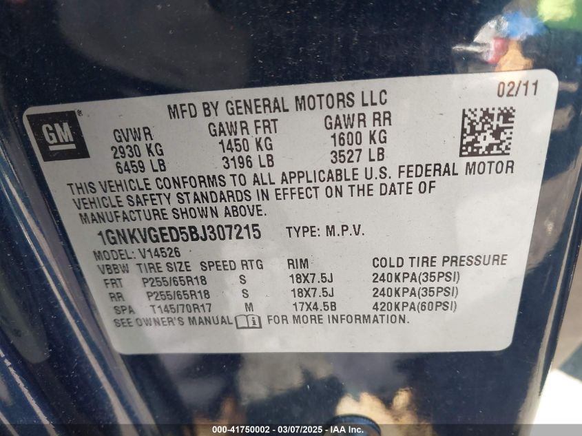 Color BlueCylinders 6Drive Full driveVIN 1GNKVGED5BJ******State Run & Drive VerifiedDamage Left side