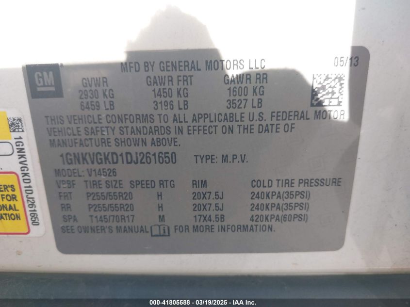 Color WhiteCylinders 6Drive Full driveVIN 1GNKVGKD1DJ******State Run & Drive VerifiedDamage Right side