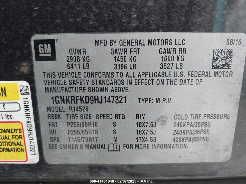 2017 CHEVROLET TRAVERSE 2017 Gasoline, 3.6, Front wheel drive, VIN - 1GNKRFKD9HJ****** from the USA
