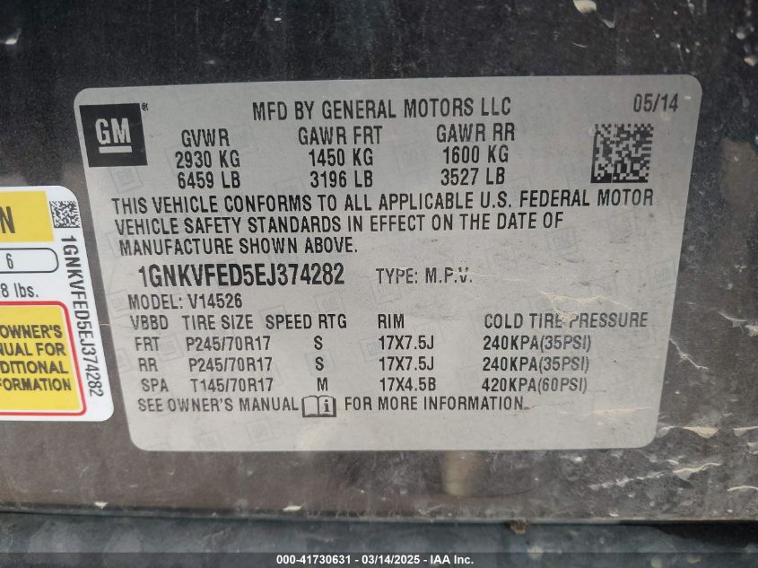 Color GrayCylinders 6Drive Full driveVIN 1GNKVFED5EJ******State Run & Drive VerifiedDamage InsignificantAuction date 2025-03-24 AutoRIA
