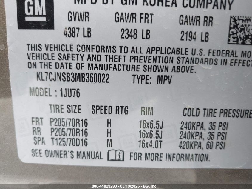 Color BrownCylinders 4Drive Full driveVIN KL7CJNSB3MB******State Run & Drive VerifiedDamage Front left