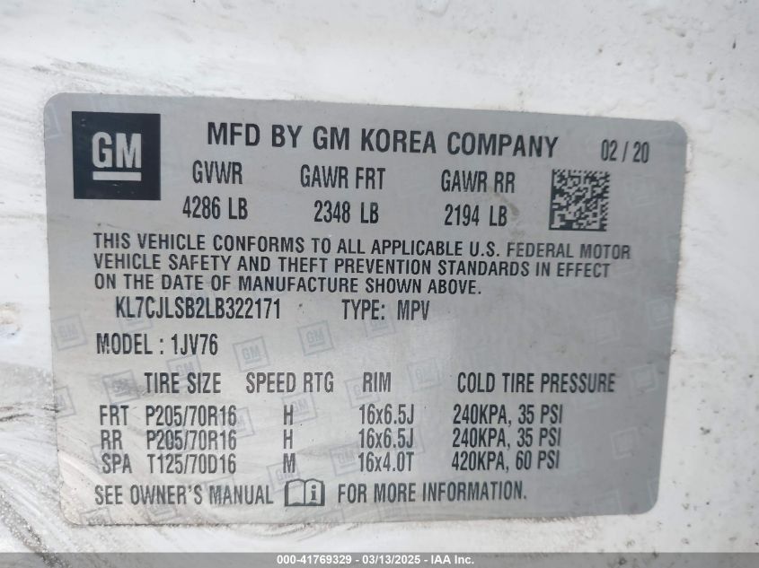 2020 CHEVROLET TRAX 2020 Gasoline, 1.4, Front wheel drive, VIN - KL7CJLSB2LB****** from the USA