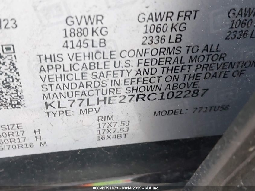 Color BlackCylinders 3Drive Front wheel driveVIN KL77LHE27RC******State Run & Drive VerifiedDamage Front or back