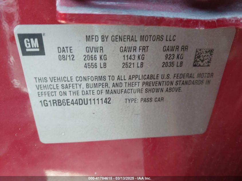 Color RedCylinders 4Drive Front wheel driveVIN 1G1RB6E44DU******State Run & Drive VerifiedDamage It is unknown AutoRIA
