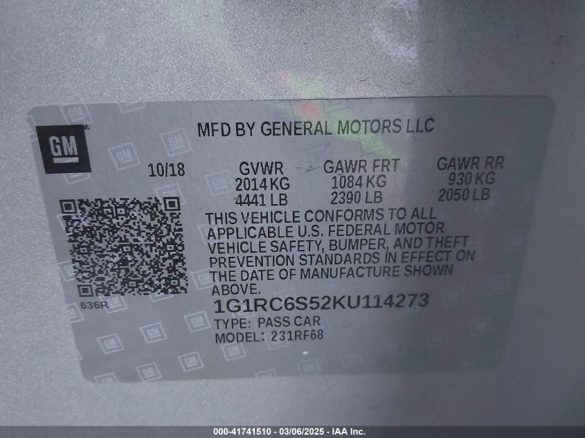 2019 CHEVROLET VOLT 2019 Hybrid, 1.5, Front wheel drive, VIN - 1G1RC6S52KU****** from the USA