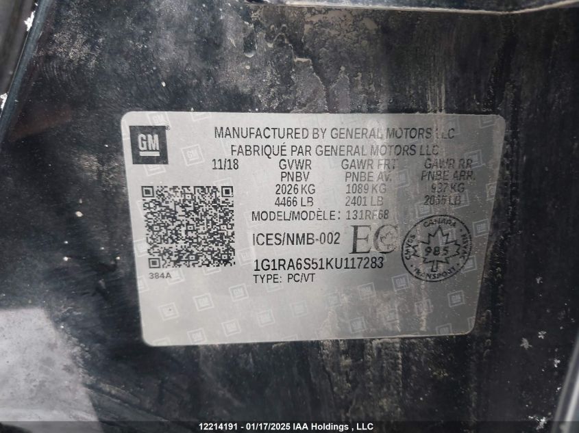 Color BlackCylinders 4Drive UnknownVIN 1G1RA6S51KU******State Run & Drive VerifiedDamage FrontAuction date 2025-03-21 AutoRIA