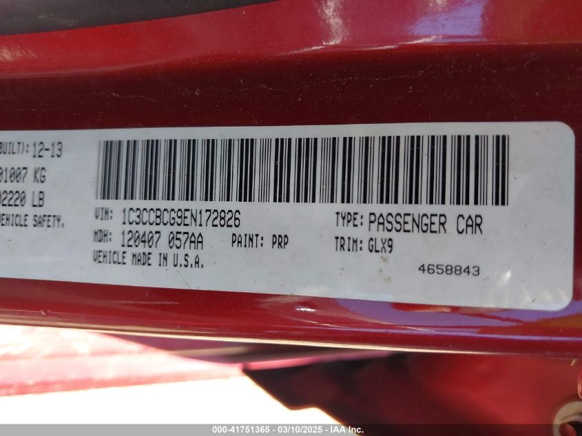 Color BurgundyCylinders 6Drive Front wheel driveVIN 1C3CCBCG9EN******State Run & Drive VerifiedDamage Left side AutoRIA