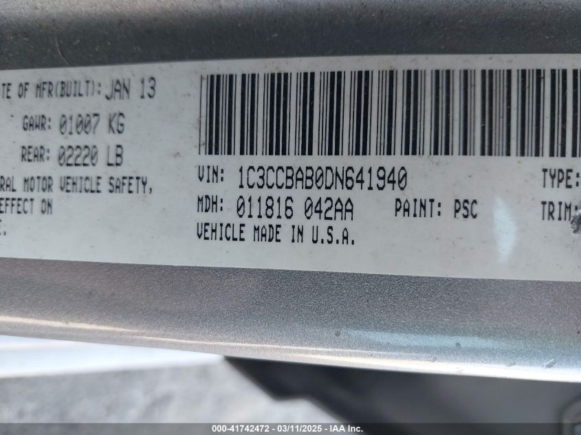 Color SilverCylinders 4Drive Front wheel driveVIN 1C3CCBAB0DN******State Run & Drive VerifiedDamage From the sidesAuction date 2025-03-20 AutoRIA