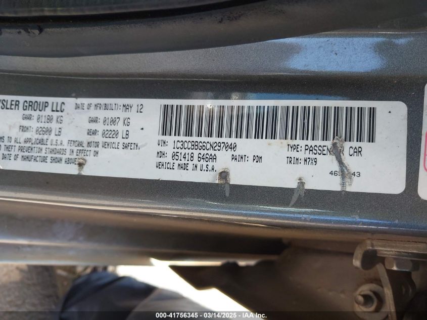 Color GrayCylinders 6Drive Front wheel driveVIN 1C3CCBBG6CN******State Run & Drive VerifiedDamage Front right AutoRIA