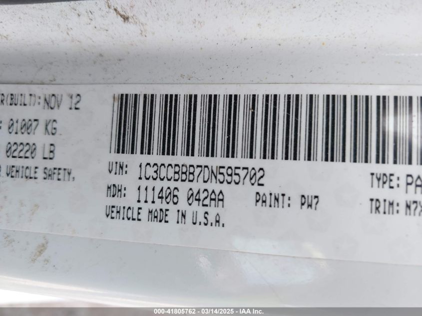 Color WhiteCylinders 4Drive Front wheel driveVIN 1C3CCBBB7DN******State Run & Drive VerifiedDamage Front and back AutoRIA