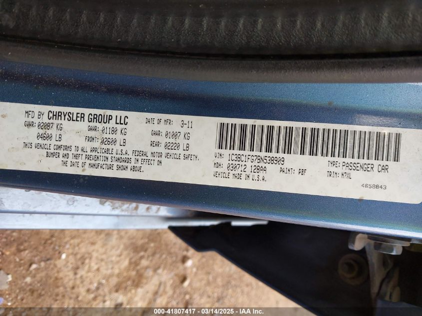 Color BlueCylinders 6Drive Front wheel driveVIN 1C3BC1FG7BN******State Run & Drive VerifiedDamage Front and back AutoRIA