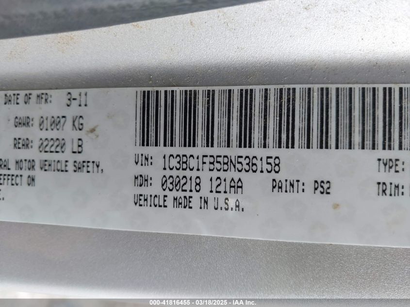 Color SilverCylinders 4Drive Front wheel driveVIN 1C3BC1FB5BN******State Run & Drive VerifiedDamage Front or back AutoRIA
