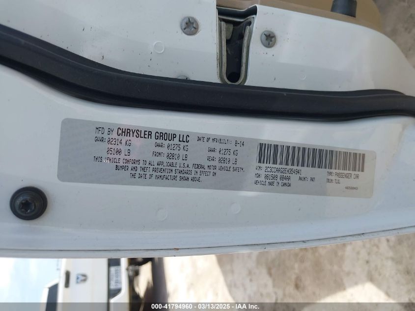 Color WhiteCylinders 6Drive Rear wheel driveVIN 2C3CCAAG2EH******State Run & Drive VerifiedDamage From the sidesAuction date 2025-03-31 AutoRIA