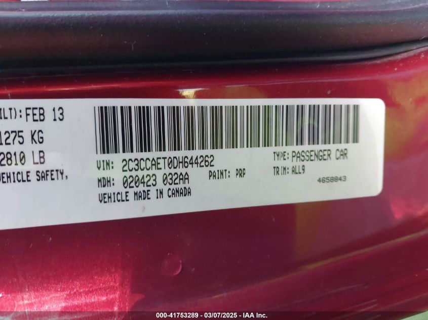 Color RedCylinders 8Drive Rear wheel driveVIN 2C3CCAET0DH******State Run & Drive VerifiedDamage It is unknownAuction date 2025-03-20 AutoRIA