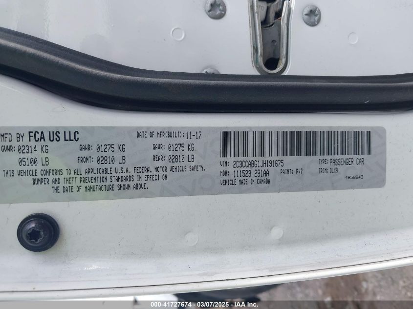 Color WhiteCylinders 6Drive Rear wheel driveVIN 2C3CCABG1JH******State Run & Drive VerifiedDamage It is unknown AutoRIA