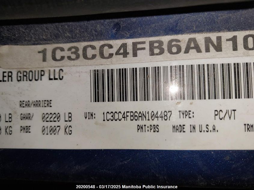 Color BlueCylinders 4Drive UnknownVIN 1C3CC4FB6AN******State Run & Drive VerifiedDamage FrontAuction date 2025-03-26 AutoRIA
