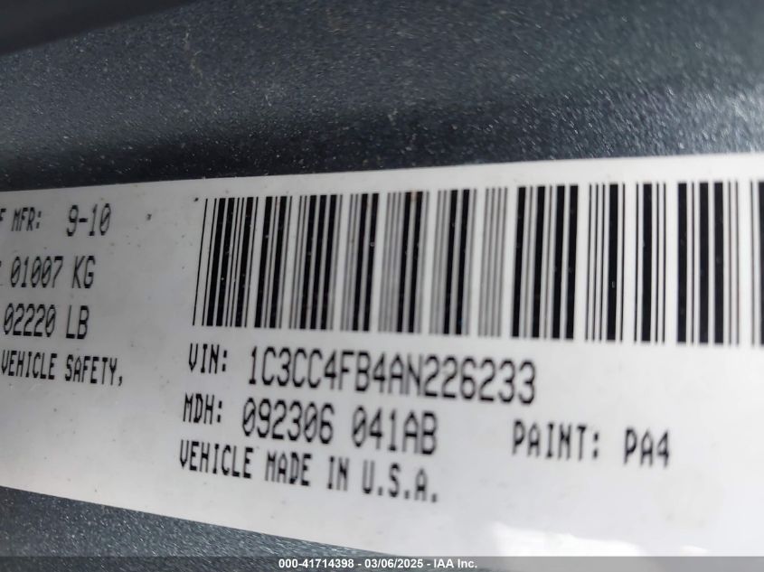 Color BlueCylinders 4Drive Front wheel driveVIN 1C3CC4FB4AN******State Run & Drive VerifiedDamage Front or backAuction date 2025-03-25 AutoRIA