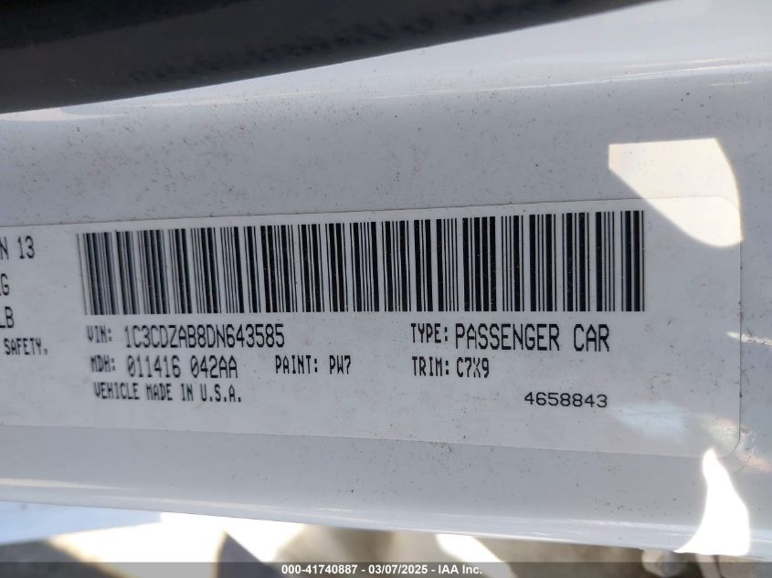 Color WhiteCylinders 4Drive Front wheel driveVIN 1C3CDZAB8DN******State Run & Drive VerifiedDamage Front right AutoRIA