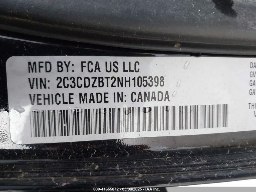 Color BlackCylinders 8Drive Rear wheel driveVIN 2C3CDZBT2NH******State Run & Drive VerifiedDamage Front left AutoRIA