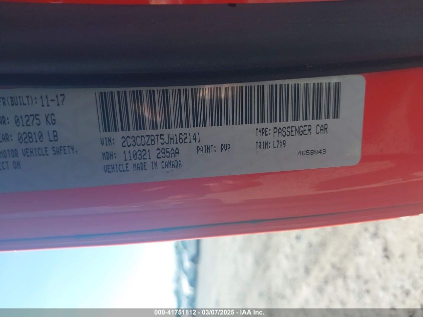 Color OrangeCylinders 8Drive Rear wheel driveVIN 2C3CDZBT5JH******State Run & Drive VerifiedDamage Front or back AutoRIA