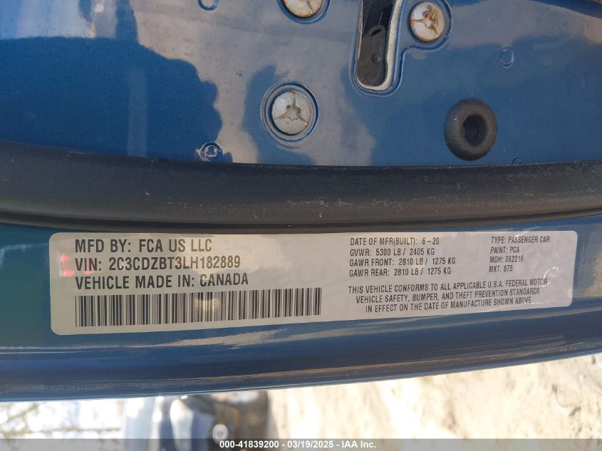 Color BlueCylinders 8Drive Rear wheel driveVIN 2C3CDZBT3LH******State Run & Drive VerifiedDamage Left side AutoRIA
