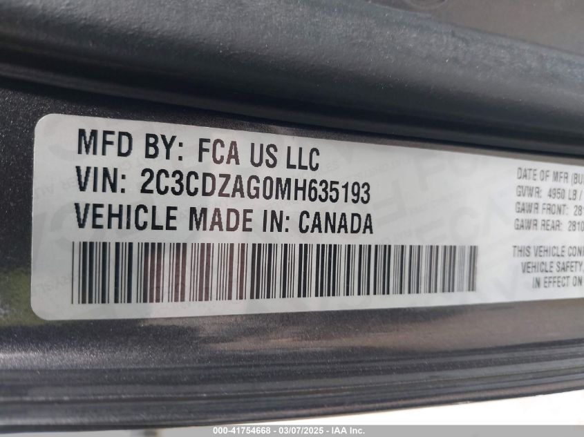 2021 DODGE CHALLENGER 2021 Gasoline, 3.6, Rear wheel drive, VIN - 2C3CDZAG0MH****** from the USA