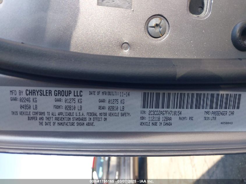 Color SilverCylinders 6Drive Rear wheel driveVIN 2C3CDZAG7FH******State Run & Drive VerifiedDamage Front right AutoRIA