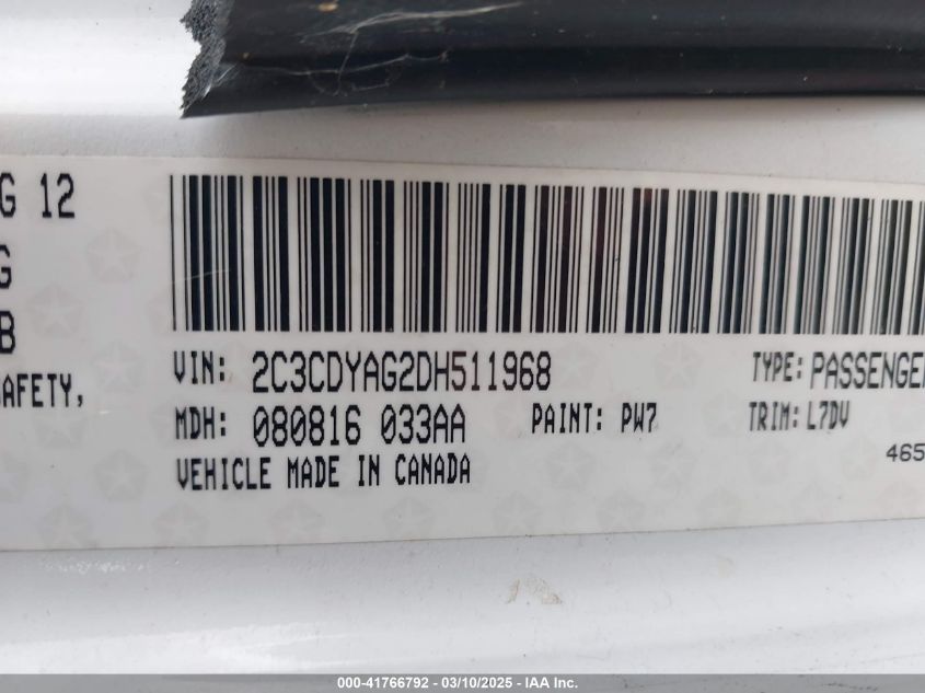 Color WhiteCylinders 6Drive Rear wheel driveVIN 2C3CDYAG2DH******State Run & Drive VerifiedDamage Bio/Chemical AutoRIA
