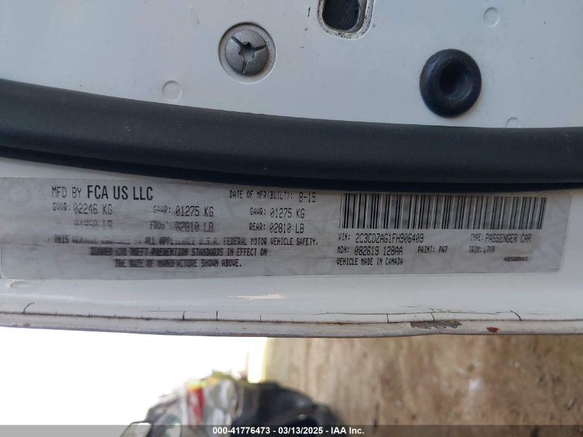 Color WhiteCylinders 6Drive Rear wheel driveVIN 2C3CDZAG1FH******State Run & Drive VerifiedDamage Front or back AutoRIA