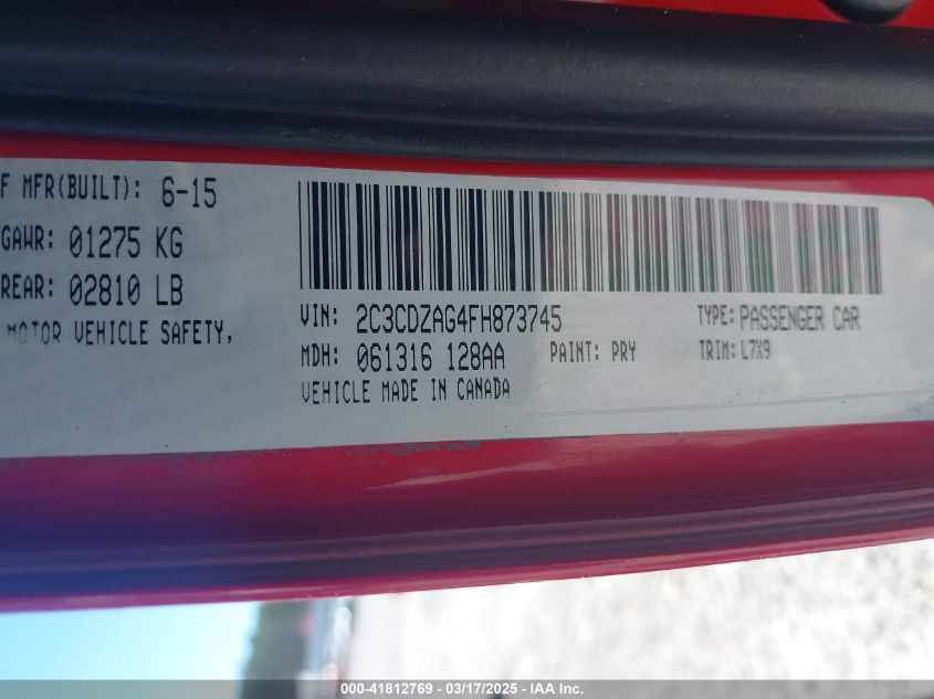 Color RedCylinders 6Drive Rear wheel driveVIN 2C3CDZAG4FH******State Run & Drive VerifiedDamage All over the car AutoRIA