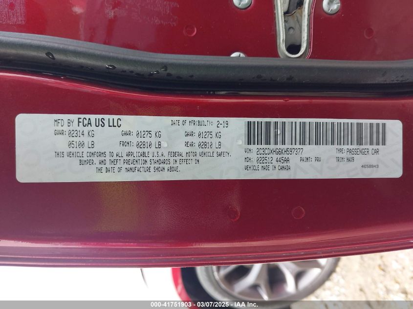 Color BurgundyCylinders 6Drive Rear wheel driveVIN 2C3CDXHG6KH******State Run & Drive VerifiedDamage Front or back AutoRIA