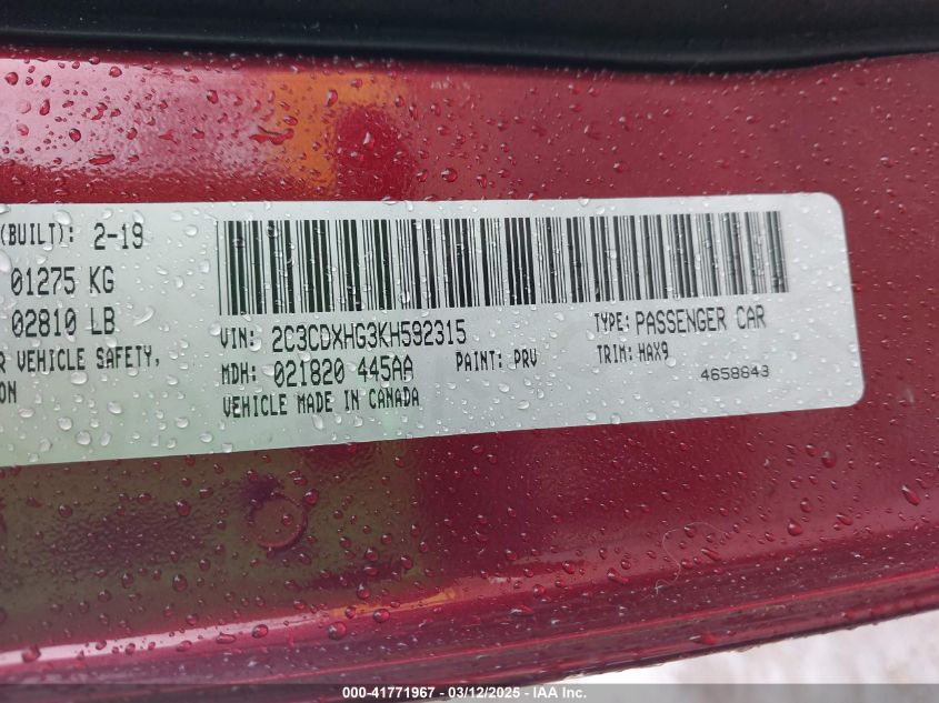 Color BurgundyCylinders 6Drive Rear wheel driveVIN 2C3CDXHG3KH******State Run & Drive VerifiedDamage Front right AutoRIA