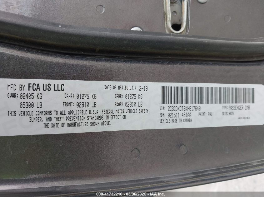 Color GrayCylinders 8Drive Rear wheel driveVIN 2C3CDXCT3KH******State Run & Drive VerifiedDamage Front right AutoRIA