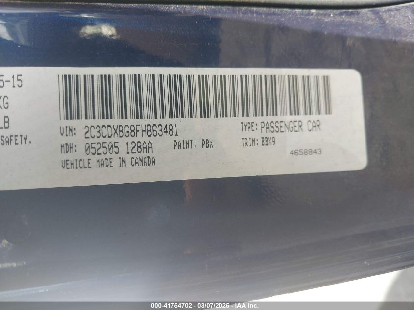 Color BlueCylinders 6Drive Rear wheel driveVIN 2C3CDXBG8FH******State Run & Drive VerifiedDamage Insignificant AutoRIA