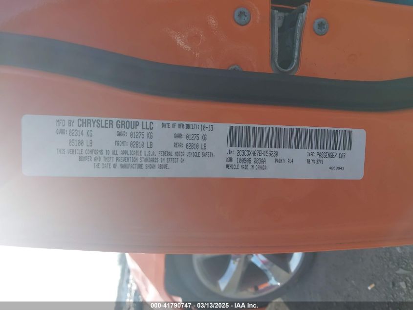 Color OrangeCylinders 6Drive Rear wheel driveVIN 2C3CDXHG7EH******State Run & Drive VerifiedDamage Front left AutoRIA