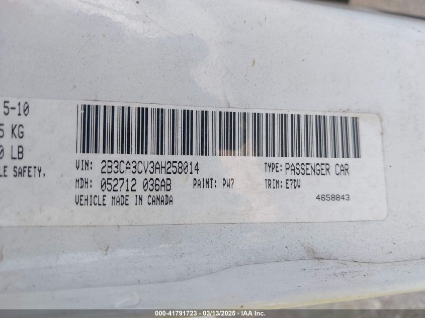 Color WhiteCylinders 6Drive Rear wheel driveVIN 2B3CA3CV3AH******State Run & Drive VerifiedDamage Due to bad weatherAuction date 2025-04-01