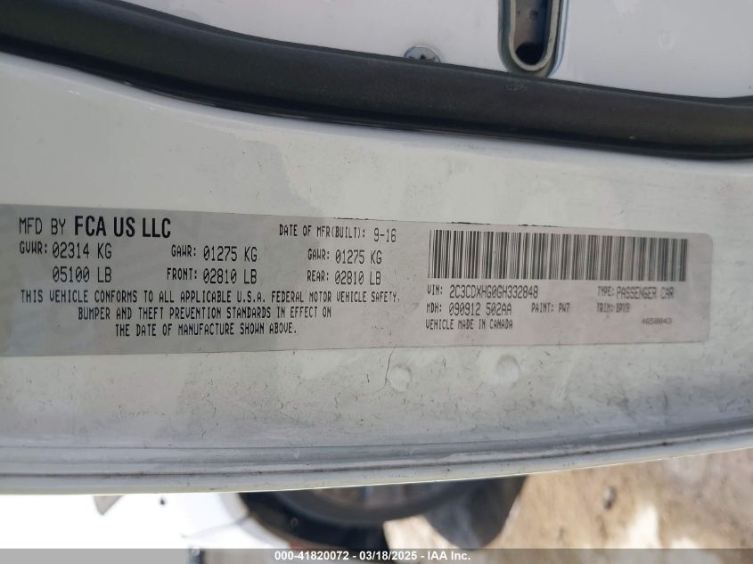 Color WhiteCylinders 6Drive Rear wheel driveVIN 2C3CDXHG0GH******State Run & Drive VerifiedDamage Front or back AutoRIA