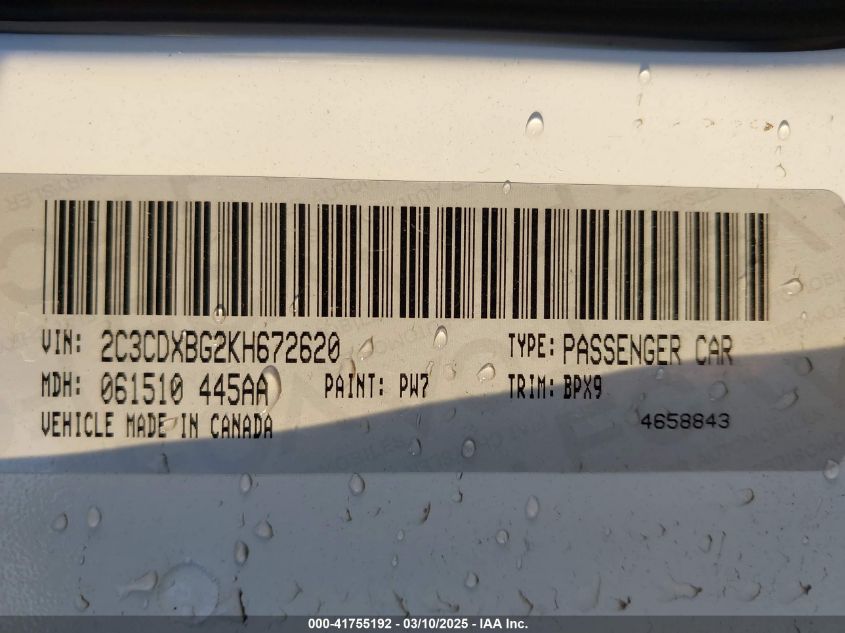 Color WhiteCylinders 6Drive Rear wheel driveVIN 2C3CDXBG2KH******State Run & Drive VerifiedDamage Front or back AutoRIA