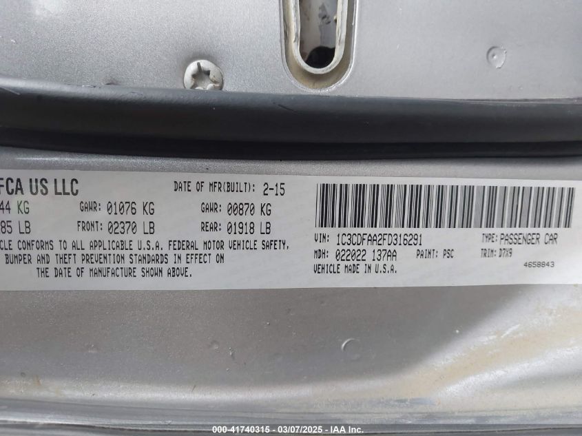 2015 DODGE DART 2015 Gasoline, 2.0, Front wheel drive, VIN - 1C3CDFAA2FD****** from the USA