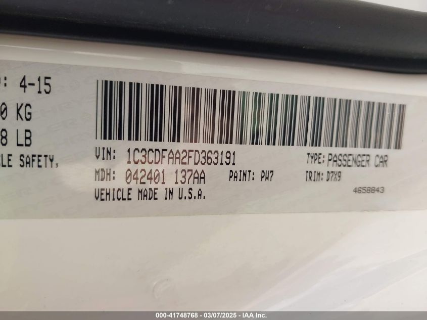 Color WhiteCylinders 4Drive Front wheel driveVIN 1C3CDFAA2FD******State Run & Drive VerifiedDamage Front right AutoRIA