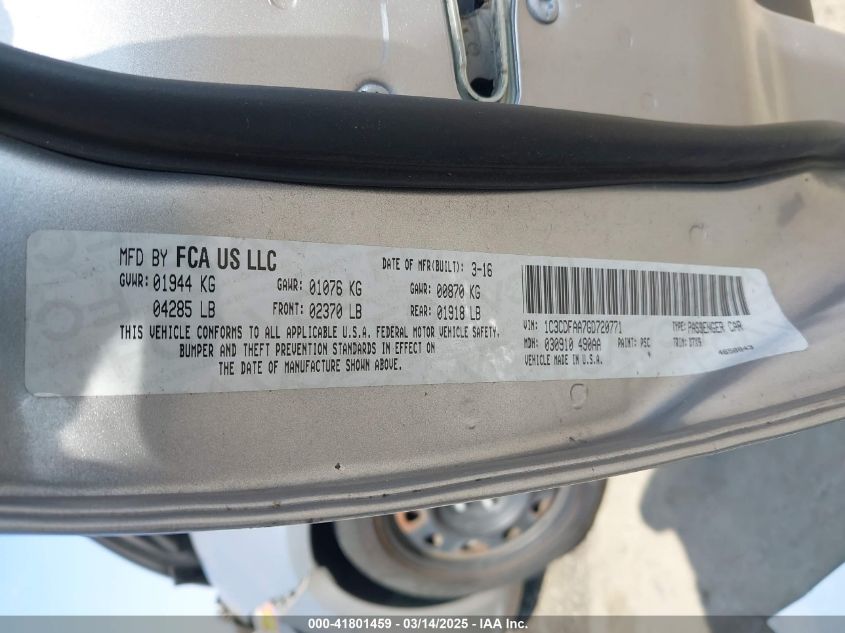 2016 DODGE DART 2016 Gasoline, 2.0, Front wheel drive, VIN - 1C3CDFAA7GD****** from the USA