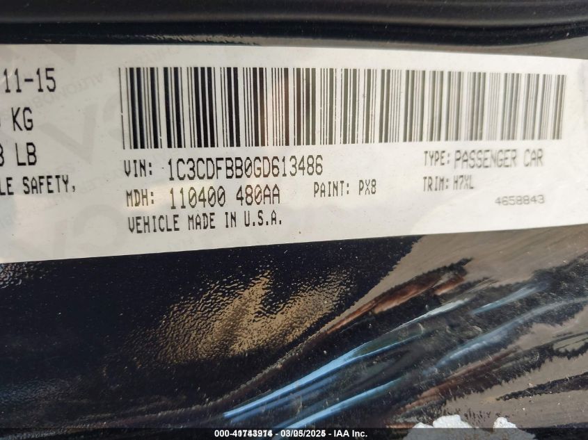 Color BlackCylinders 4Drive Front wheel driveVIN 1C3CDFBB0GD******State Run & Drive VerifiedDamage Back AutoRIA