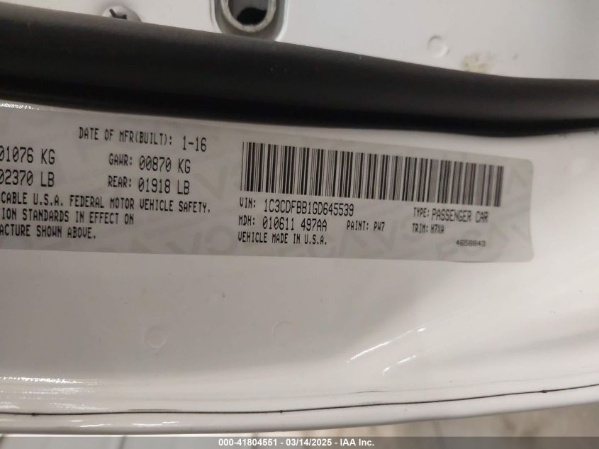 Color WhiteCylinders 4Drive Front wheel driveVIN 1C3CDFBB1GD******State Run & Drive VerifiedDamage Front or back AutoRIA
